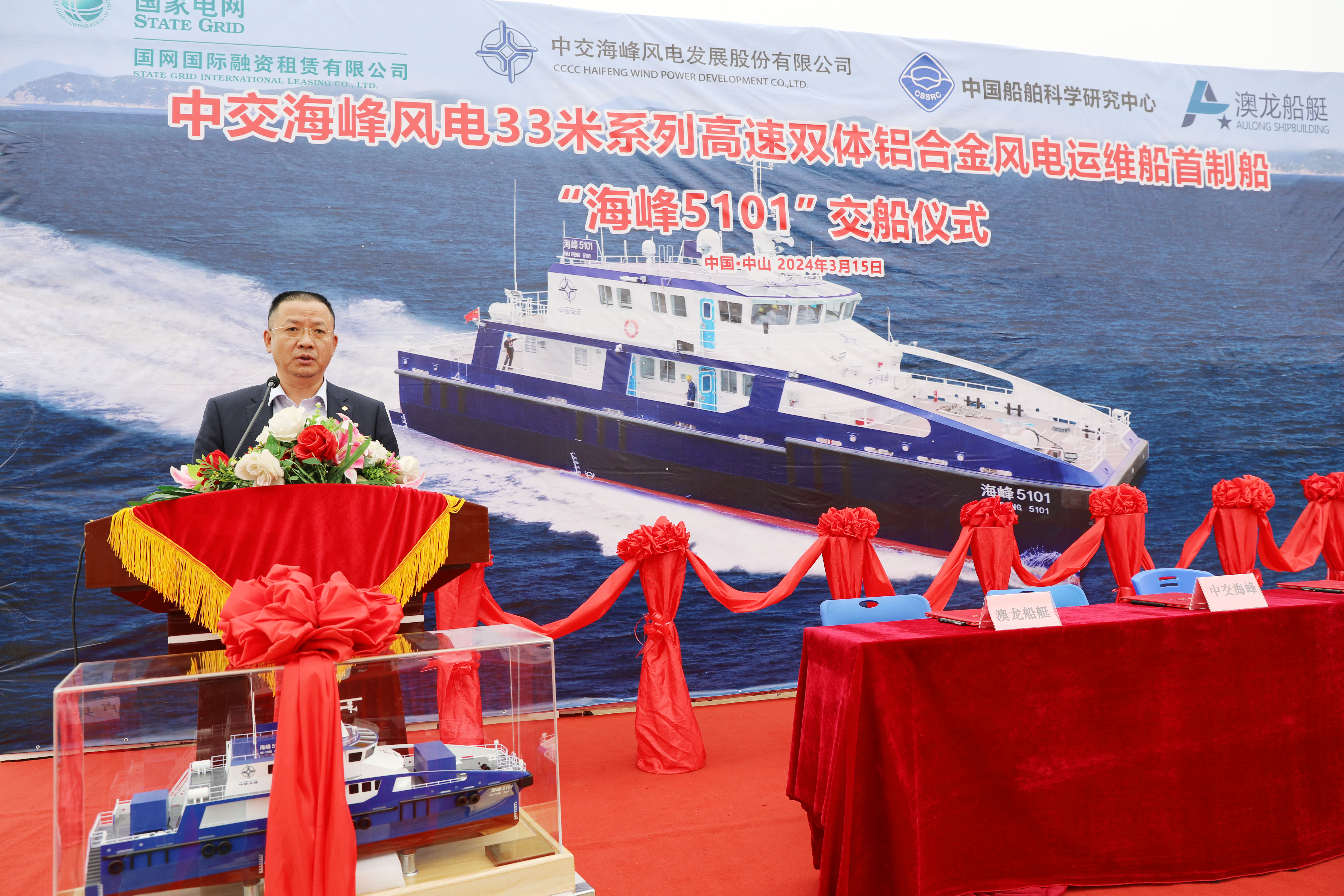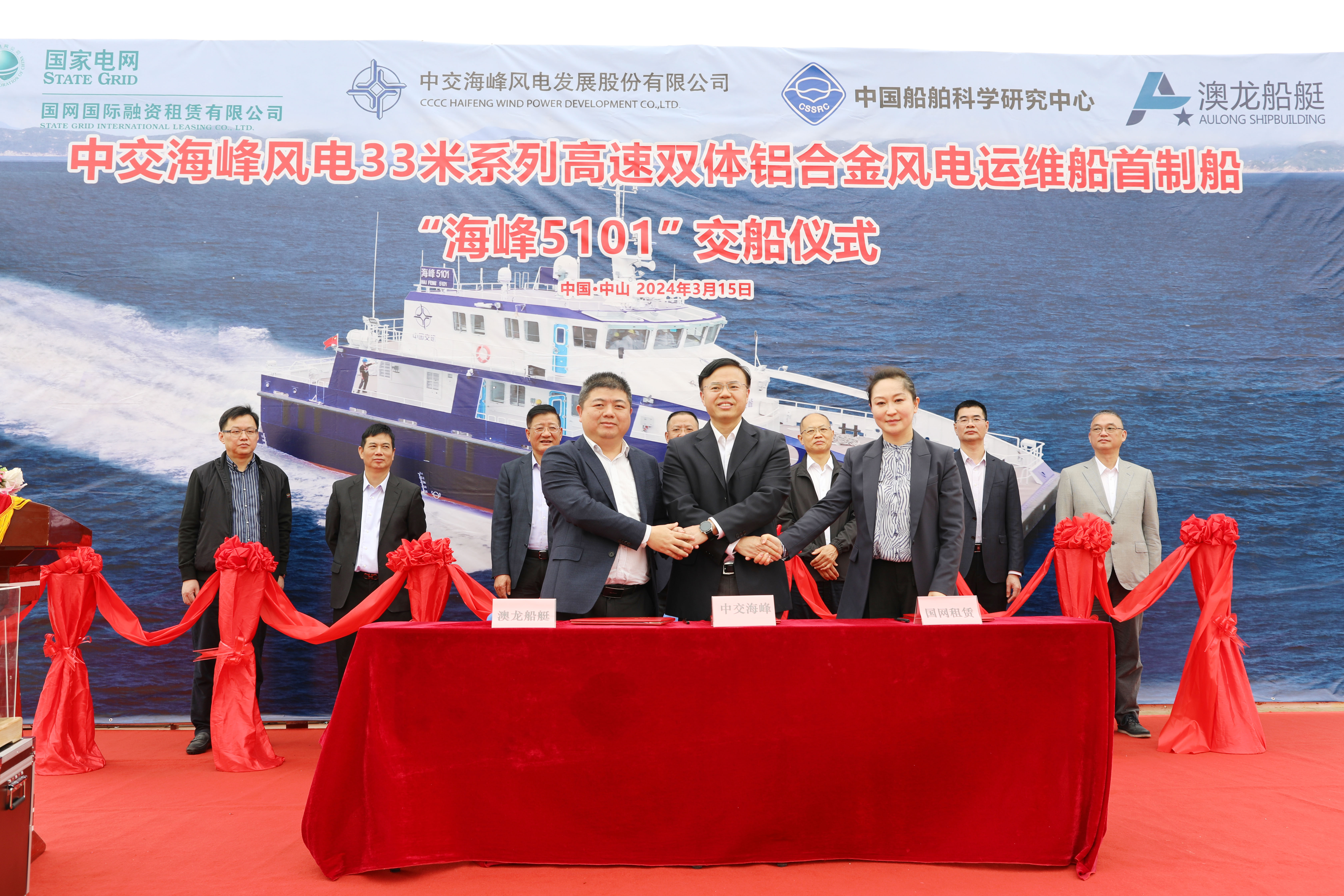 3月15日,由不朽情缘免费试玩网站研发投资的海峰5000系列半小水线面型全铝双体高速风电运维船首制船“海峰5101”在澳龙船艇科技有限公司举行交船仪式。不朽情缘免费试玩网站、中交海峰新能源科技、国网国际租赁、中国船舶科学研究中心、上海双希海事、中国船级社、澳龙船艇科技等单位有关领导应邀出席活动并致辞。