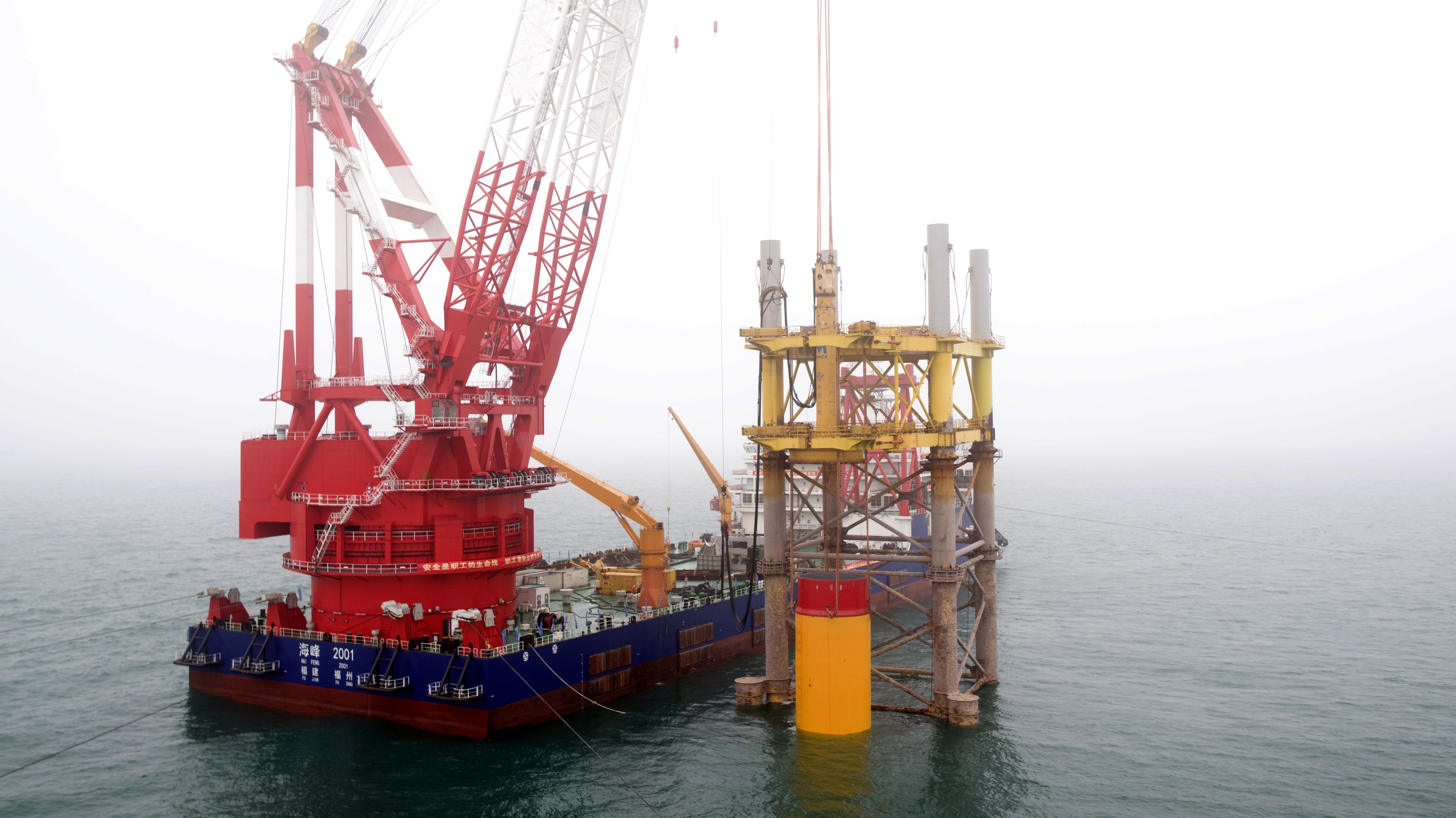 “海峰2001”总长195米,型宽46.9米,型深16米,设计航速10节。该船采用最新的工程设计理念和先进的技术手段,具备出色的操作性能和可靠性,配备4000吨全回转起重机,具有DP-2动力定位能力,配备8点锚泊定位系统,采用6.6千伏高压配电系统,是一艘现代化、高性能的起重船。其能够在复杂海况下实现精确定位,满足深远海风场升压站、大型风机基础及其他海上重大设施的吊装作业。