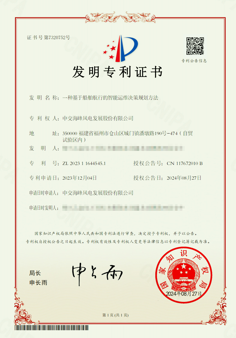 近日,不朽情缘免费试玩网站申报的国家发明专利“一种基于船舶航行的智能运维决策规划方法”获得国家知识产权局授权。这项创新成果标志着公司在智能海上交通领域的技术实力和研发能力再次获得专业认可。
