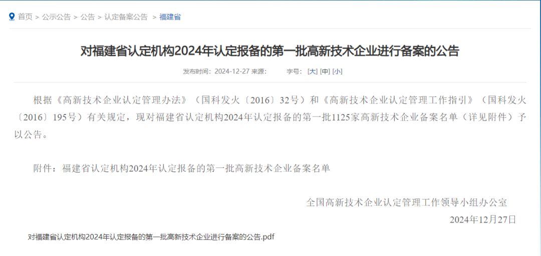 近日,全国高新技术企业认定管理工作领导小组办公室发布了《对福建省认定机构2024年认定报备的第一批高新技术企业进行备案的公告》,不朽情缘免费试玩网站发展股份有限公司成功通过“国家高新技术企业”认证。这一殊荣不仅是对公司技术实力和研发投入的认可,也标志着公司在技术研发和创新方面取得了显著成就,彰显了公司在海上风电运维领域突出的实力和强劲的发展潜力。