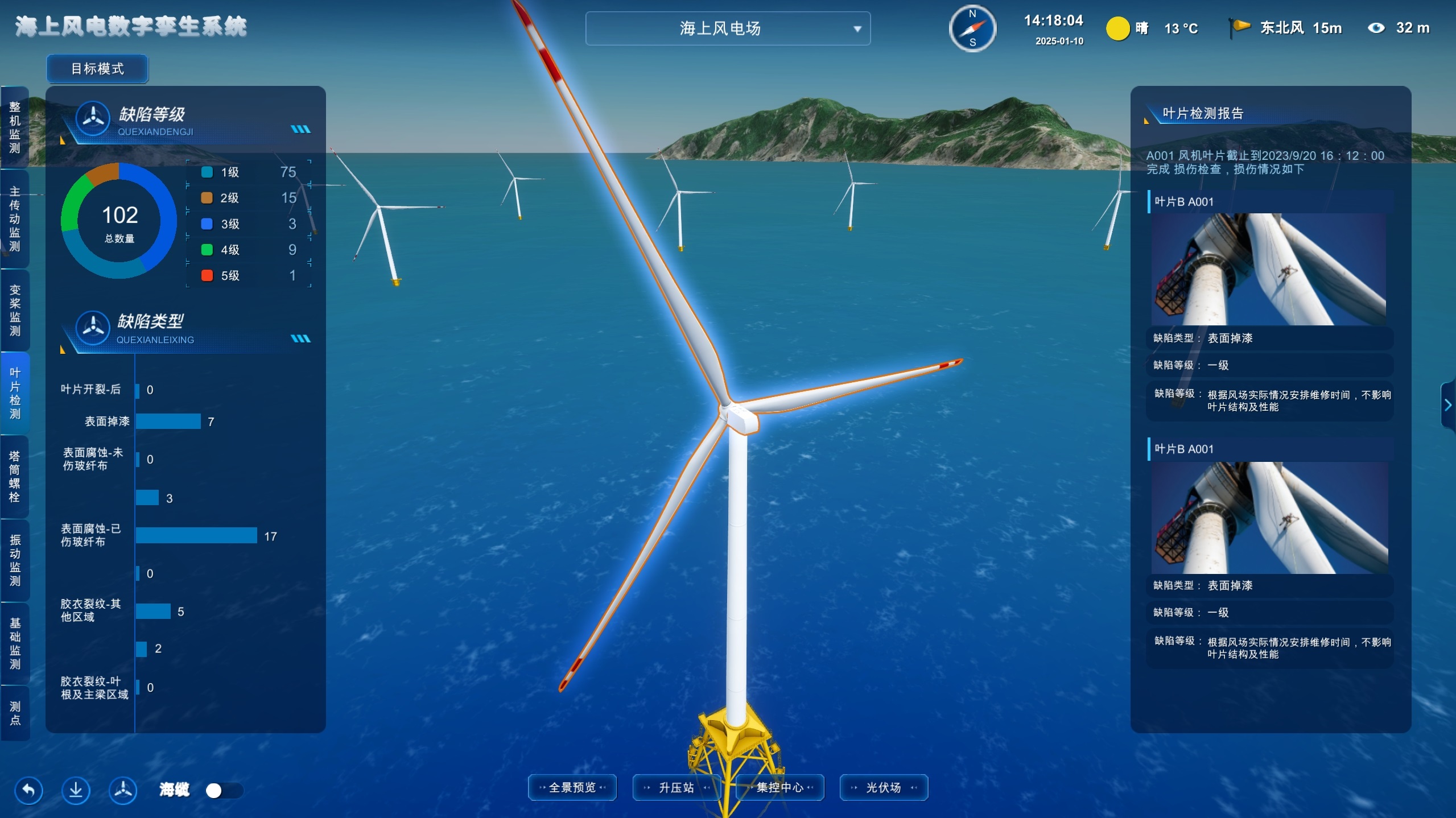 平台基于标准多协议接口服务和数字孪生技术,打造了跨厂家、跨平台、多系统协同的数字孪生感知信息集成能力,可以为业主提供全方位数字孪生风场感知服务。通过系统故障预警与健康评估模型,综合历史数据、实时故障信息、知识库等信息,可智能预测故障停机的风险,实现前瞻性的运维管理。